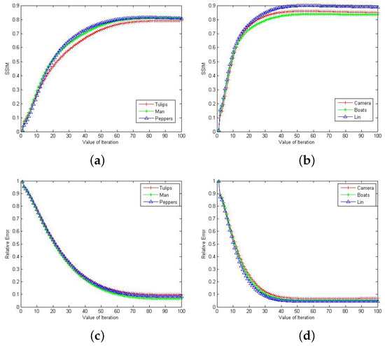 where and are the means of the and z, respectively. and represent the standard deviation of the and z, respectively, and represents the covariance of the and z. and are normal numbers with denominator values close to zero. As the PSNR value is higher, the SSIM value is nearer to 1, and the image recovery is better. In all experiments, the stop criterion is set to