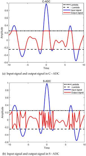 Conceptual difference between the C−ADC and S−ADC. (a) Input signal and output signal in C−ADC; (b) input signal and output signal in S−ADC.