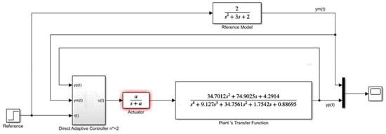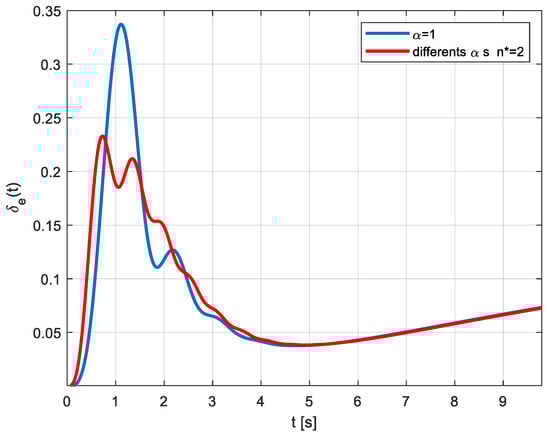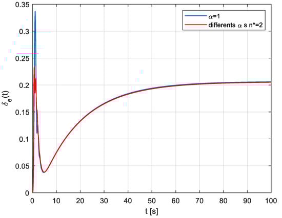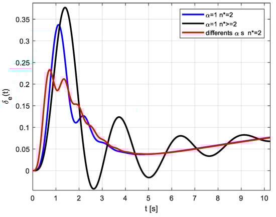 It is promising to say that, when possible, it is useful to decrease the relative degree of the plant to 2, since the performance is better than in the cases of larger relative degrees, in which case one is obliged to use the generalized scheme () that is more complex to implement due to errors and auxiliary blocks. In addition, the fact that the output signal to be controlled is subject to oscillations and overshoots in the transient period, this phenomenon does not occur when case of is considered. Finally, it is important to note, as said before, this is the first time that an FOAC is used in the longitudinal control of an airplane using fractional-order adaptive laws applied to an integer-order system (airplane model) without changing the classic structure of MRAC. Finally, the analysis of asymptotic stability is a subject still pending for future research work in the field of fractional-order MRAC control systems.