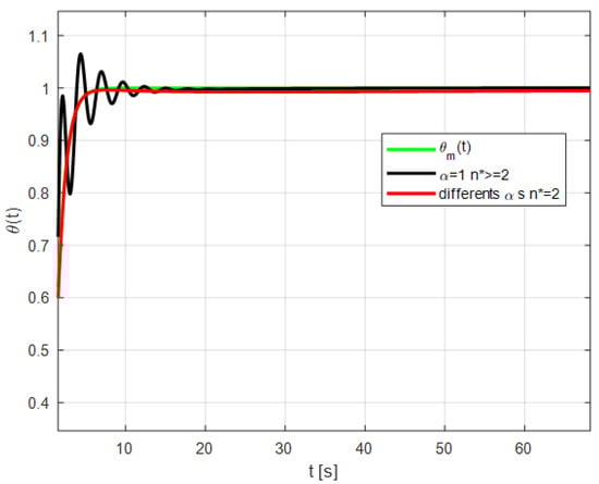 is the reference signal or the desired evolution of the pitch angle (green color). The signal in black is the plant output when the generalized IO-DMRAC implementation is used (i.e., ), and finally in red, the plant output is shown when FO-DMRAC is considered using the simple structure ()