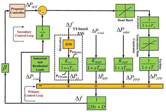 where is the MG frequency deviation, , , , and denote the power changes in TPP, VI-based ESS, WPP, and PPP, respectively; and are the power variations in wind and solar irradiation, respectively; shows the secondary controller output, and finally, expresses the power changes in the industrial and residential loads.