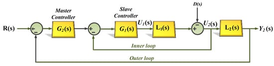 The control of two successive processes relates to the idea of cascade control. Cascade control can increase the efficiency of the control system in comparison to single-loop control []. Figure 3 demonstrates the structure of the cascade control system. As shown, the cascade control includes two inner and outer control loops, in which the inner loop output provides the second process or input of the outer loop. The inner loop in the cascade control, known as the slave controller, rejects the effects of perturbations in a comparatively quicker procedure before transferring them to different parts of the plant. The inner loop mainly alleviates the impact of deviations related to the internal process coefficients (owing to set-point variations and perturbations) on the control system’s efficiency. The outer loop, known as a master controller, handles the final output quality of the process to attain a reference signal R(s) [].