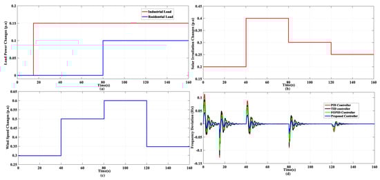Perturbations and simulation result for scenario 4. (a) Load disturbances. (b) Wind speed changes. (c) Solar irradiation changes. (d) Obtained frequency responses.