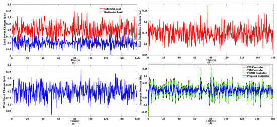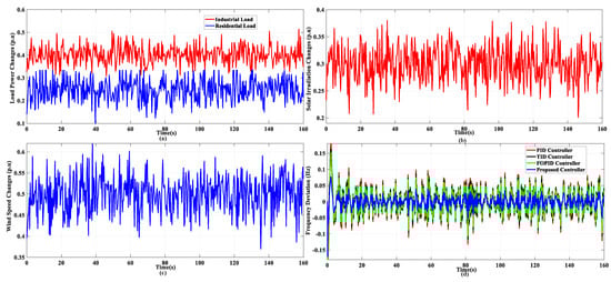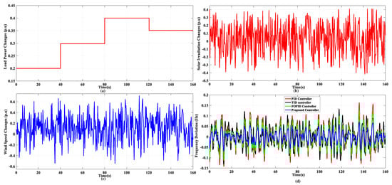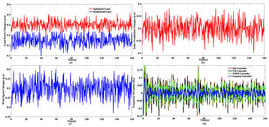 In this scenario, the suggested controller efficiency is investigated under random residential and industrial changes, as shown in Figure 7a. Patterns associated with solar irradiation and wind speed disturbances are presented in Figure 7b,c, respectively. It is evident that the presented FOCC controller provides better handling of the disturbances and improves the system’s dynamic performance compared to other controllers. Table 4 indicates the MAGFDs of this scenario. The proposed controller in this scenario has the lowest MAGFD compared to the other controllers, as in the prior scenarios.