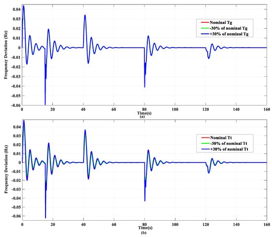 This subsection analyzes the robustness of the proposed FOCC controller against the system parameters’ changes. In this regard, the ±30% variations are applied to Tg and Tt parameters under scenario 1 conditions. Figure 10a,b demonstrates the MG frequency responses attained by the proposed FOCC controller under normal conditions and ±30% reduction in the Tg and Tt parameters, respectively. According to these figures, it can be noted that the responses under normal conditions and considered changes are almost similar. The MAGFD values for this subsection are presented in Table 5. This table reveals that these changes do not significantly impact the MAGFD values using the proposed FOCC controller. Accordingly, the system stays stable.