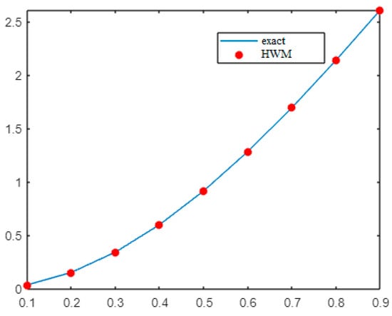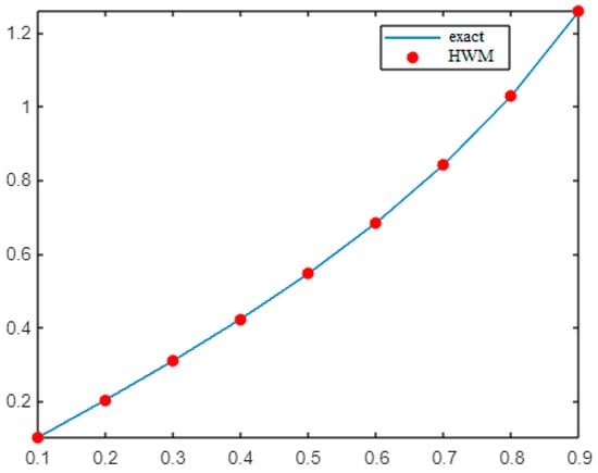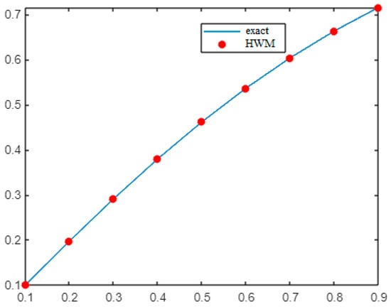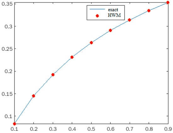 The absolute errors, calculated as absolute difference between the exact and approximate solutions, is presented for several m’ parameters in Table 1. As can be seen from Table 1, the Hermite Wavelet Method (HWM) error decreases with the increased resolution. The absolute errors are approximately on the order of E-4, E-5 for , on the order of E-5, E-6 for , and on the order of E-6, E-7 for . A comparison with the Orthogonal Function Method (OFM) [], Variational Iteration Method (VIM) [], Adomian Decomposition Method (ADM) [], and the Finite Difference Method (FDM) [] is presented in Table 2. As can be seen from the table, the proposed method can be said to converge better than the other methods. The exact solution and HWM results for are plotted in Figure 1. As can be seen from the figure, the numerical solution follows the exact solution closely.