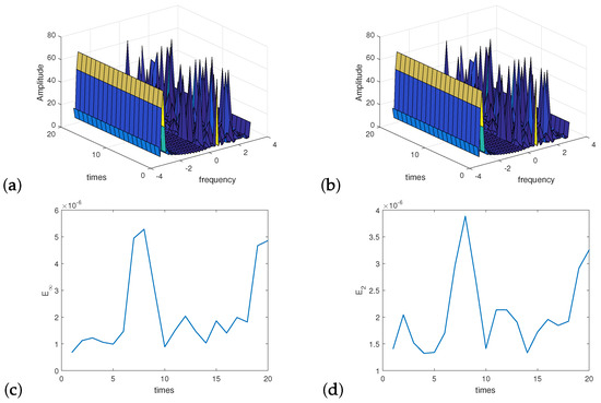 Twenty independent experiments. Amplitude (a) obtained by directly summation Equation (10); (b) obtained by Algorithm 3. Error of amplitude between the direct summation and Algorithm 3 (c) ; (d) .