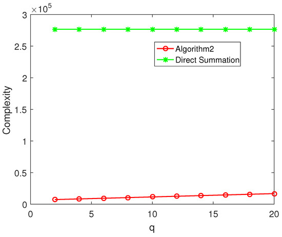 When , complexity comparison between Algorithm 2 and direct summation for different q.