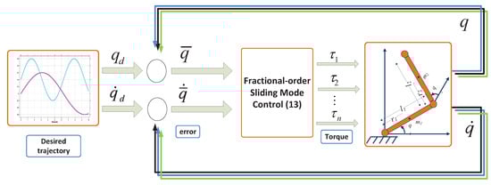 A type of notable non-linear robust control approach is known as sliding mode control (SMC) [13,14,15]. It has the capability to successfully control uncertain non-linear dynamics with low susceptibility to changes in system parameters and disturbances. There have been a number of developments in the area of SMC, including terminal SMC (TSMC), non-singular SMC (NSMC), fast SMC (FSMC), integral SMC (ITSMC), and fast non-singular FSMC (NFSMC) [16,17,18]. To further enhance the controller’s functionality, fractional-order control (FOC) has been integrated with SMC [19,20,21]. Researchers have found Fo control, around for three hundred years, is formulated with calculus of a non-integer-order and can be applied in a wide range of scientific fields [22,23,24,25]. A significant number of fractional-order SMC (FoSMC) methods have also been developed and implemented in various Euler–Lagrange systems [5,26].