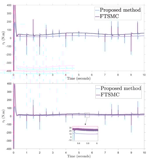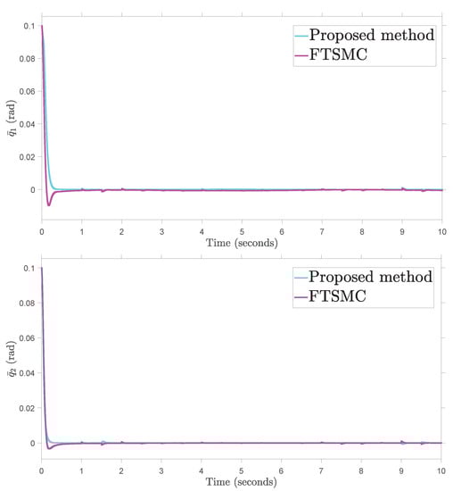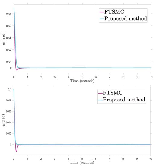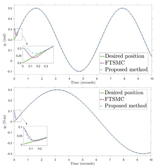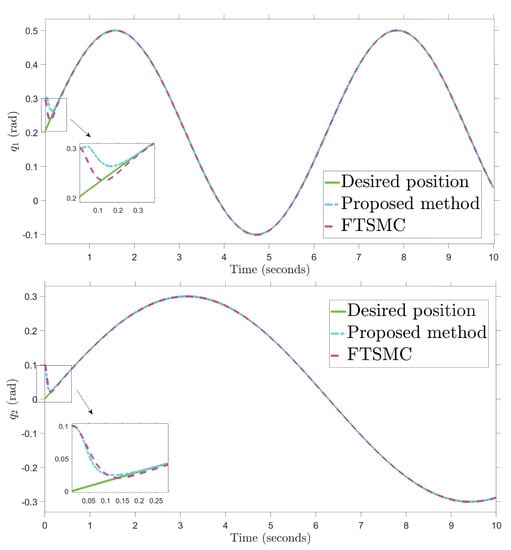 This subsection presents the implementation of the suggested FoFtNTSM controller in the robotic manipulator. The fractional-order value is selected using a trial-and-error method. The desired trajectories quickly approach the suitable value of = 0.9. Moreover, the appropriate parameters of the proposed control scheme are given in Table 2. When comparing simulations, fractional-order sliding mode control (FTSMC) [48] is used to further prove the effectiveness of the planned method. The required parameters of the compared FTSMC scheme are selected fairly. The compared results of the proposed method and FTSMC to the dynamics of 2-DOF robotic manipulators are shown in Figure 2, Figure 3 and Figure 4. Position accuracy, tracking error and control inputs without chattering are all depicted here.