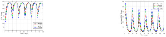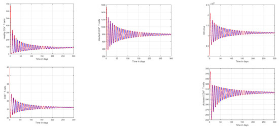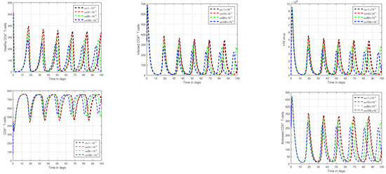 Illustration of the tracking paths of healthy CD4 T-cells, infected CD4 T-cells, HIV virus, CD8 T-cells, and activated CD8 T-cells of HIV infection with the variation of input factor , i.e., , and .