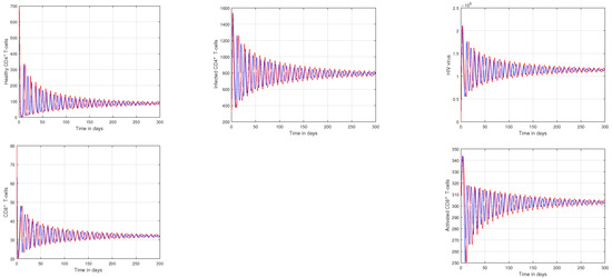 Plotting the tracking paths of healthy CD4 T-cells, infected CD4 T-cells, HIV virus, CD8 T-cells, and activated CD8 T-cells of HIV infection for different fractional parameter values, where the blue curve signifies and the red curve signifies .