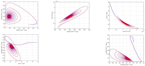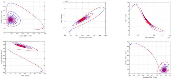 Illustration of the dynamical behavior of different cells to show the phase portrait of healthy CD4 T-cells vs. infected CD4 T-cells, infected CD4 T-cells vs. HIV virus, HIV virus vs. CD8 T-cells, CD8 T-cells vs. activated CD8 T-cells, and activated CD8 T-cells vs. healthy CD4 T-cells with the input values , and .