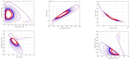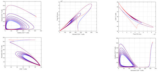 Illustration of the the dynamical behavior of different cells to show the phase portrait of healthy CD4 T-cells vs. infected CD4 T-cells, infected CD4 T-cells vs. HIV virus, HIV virus vs. CD8 T-cells, CD8 T-cells vs. activated CD8 T-cells, and activated CD8 T-cells vs. healthy CD4 T-cells with the input values and .