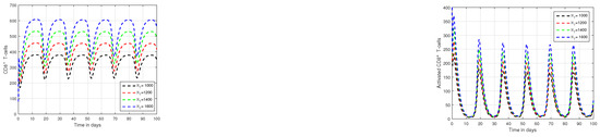 Representation of the time series of the CD8 T-cells and activated CD8 T-cells with the variation of input factor , where the curves for , and 1600 are indicated by black, red, green, and blue, respectively.