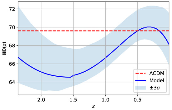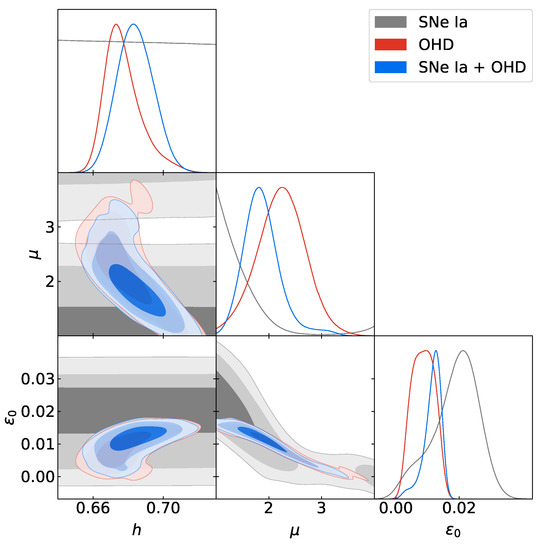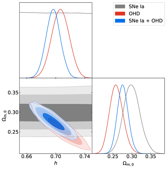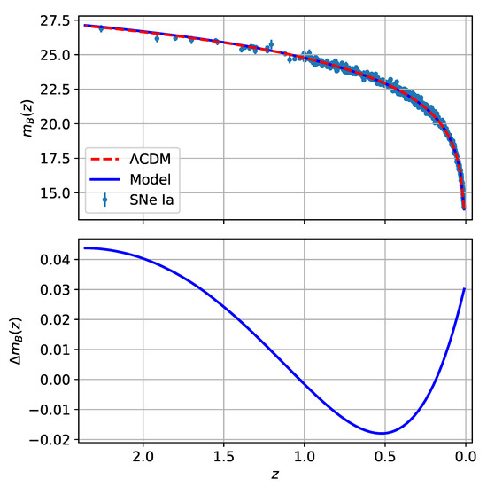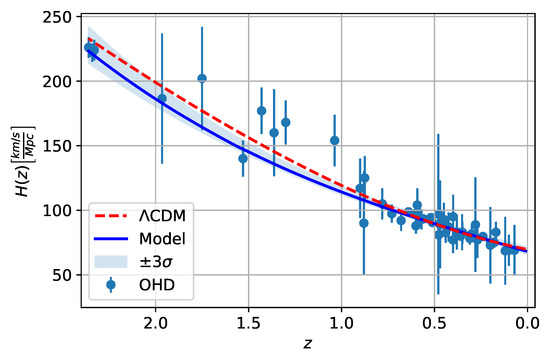 Since 1998, when the independent projects High-z Supernova Search Team [67] and Supernova Cosmology Project [68] obtained results that suggested this behavior in the Universe, the type Ia supernovae (SNe Ia) data have become a definitive proof to study this era of the Universe and the transition between the decelerated expansion phase and the accelerated one. However, the latter is usually model dependent [69]. In this sense, the observational Hubble parameter data (OHD), also known as cosmic chronometers, have become a fundamental data test, complementary to the SNe Ia data, to study the Universe’s expansion rate in a model-independent way. Finally, using these cosmological data, we estimate the free parameters .