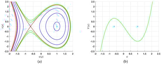 (a) Phase portrait when with () and (b) the potential function. The cyan solid circles are the equilibrium points.