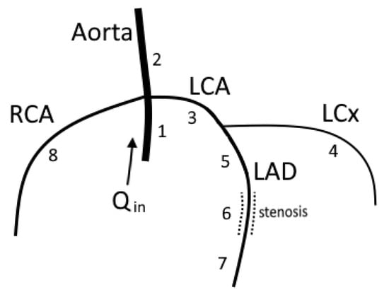 Atherosclerotic diseases of coronary vessels are the main reason for myocardial ischemia frequently resulting in disability or death. These diseases are mainly caused by blockages due to an abnormal narrowing in a blood vessel—stenosis []. The choice of medical treatment involves evaluation of stenosis significance, which may require invasive measurements. To assess the severity of each stenosis case, clinicians use various hemodynamic indices. The most popular and well-developed index is the fractional flow reserve (FFR), which is a ratio between mean pressure distal (downstream) to stenosis and mean aortic pressure during artificially induced hyperemia [,]. Stenoses with values of FFR below 0.8 are considered to be significant and should be surgically treated.