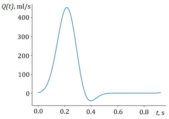 On the inlet of the aorta (segment 1 on Figure 1), we set cardiac the output as a periodic time function (Figure 2). The shape of the cardiac output was proposed in []. It can be adjusted according to the patient’s heart rate (HR), stroke volume (SV), or other data (peak-to-mean flow ratio, QT-interval).