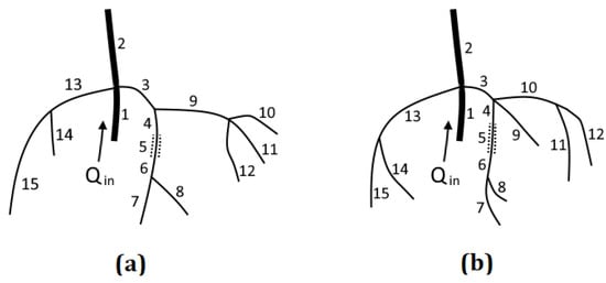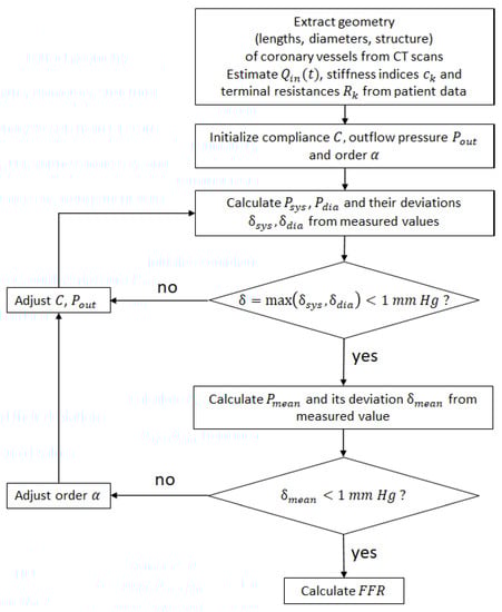 One of the most important problems in patient-specific blood flow modeling is to identify the parameters of the model. Diameters, lengths, and overall arterial structure can be extracted from CCTA images with the help of segmentation and skeletonization algorithms []. Parameter c in (3) represents the pulse wave velocity and can be estimated from the patient’s age, blood pressure, heart rate, and stroke volume with the help of machine learning methods []. Terminal resistances in (6), (7) and (9) are calculated from systemic vascular resistance (the ratio between mean pressure and cardiac output) and the diameters of the terminal arteries [].