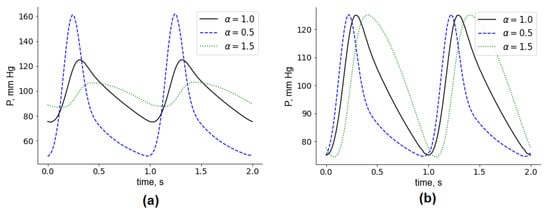 By adjusting C and in (6) and (7), we can reproduce patient’s systolic and diastolic blood pressures. However, the range of possible blood profiles is quite limited. To improve the mathematical model, additional elements can be introduced into the arterial structure and the Windkessel model []. Instead, in this paper, we propose to use the fractional time derivative in Equation (7).