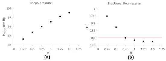 Mean pressure and FFR for a simplified network of coronary arteries. (a) Mean pressure and . (b) FFR and . The horizontal red line corresponds to FFR = 0.8—threshold value between significant (FFR < 0.8) and insignificant (FFR > 0.8) stenoses.