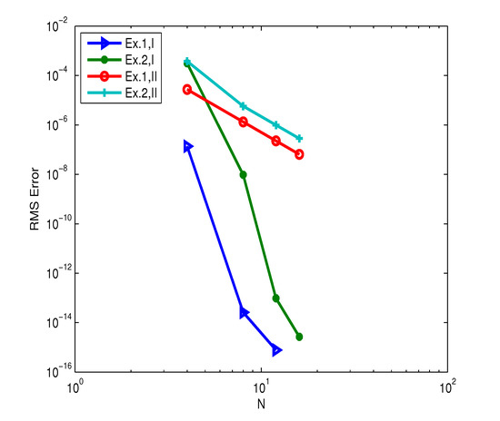In the numerical simulations, we used the fourth-order Runge–Kutta method, a highly accurate algorithm, to solve the system of ODEs (20) and chose = 1.0 × 10 to make sure that the error resulting in the direction of time was small enough. We performed the numerical simulations with the fractional orders being , , and and chose the CGL, LGL, and JGL() quadrature nodes as collocation points. In Table 1 and Table 2, we show the root-mean-squared (RMS) errors of the numerical solution at the collocation points at of Examples 1 and 2, respectively. The RMS errors of these two numerical examples with using our method and the Jacobi operational matrix method proposed in [21] are plotted in Figure 1. The numerical results indicated the fast convergence of the methods and illustrated that our proposed algorithm in this section performed much better than the methods in [21].