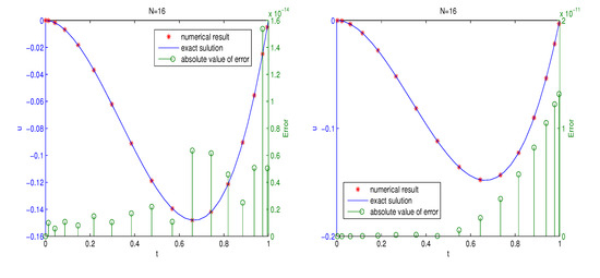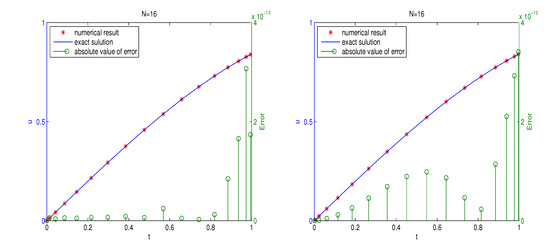 We took the fractional order to be , used the LGR collocation points, and chose in the numerical simulations. The absolute errors at the collocation points of Example 3 and 4 are plotted in the right panel in Figure 2 together with the numerical results produced by the methods proposed in [39]. The FIDE (21) was converted into an integral equation by taking the fractional-order integral and then approximated by the Gaussian quadrature rule with Jacobi collocation points in [39]. One can observe from the figure that the algorithm proposed in the section performs better compared to the methods in [39]. The numerical results matched well with the analytic solutions of the two examples, which demonstrated that the proposed scheme (26) worked accurately for the initial fractional integro-differential Equation (21).