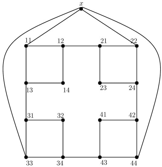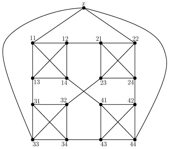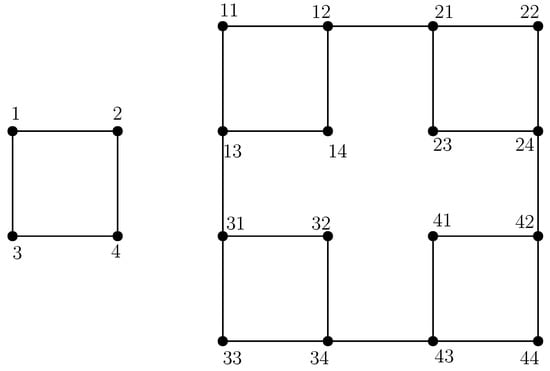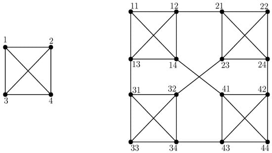 This construction of Sierpiński graphs was generalized by Gravier et al. [] for any graph by defining the th generalized Sierpiński graph of denoted by as the graph with vertex set and edge set defined as follows: is an edge if and only if there exists such that