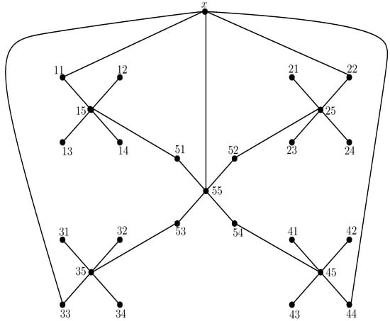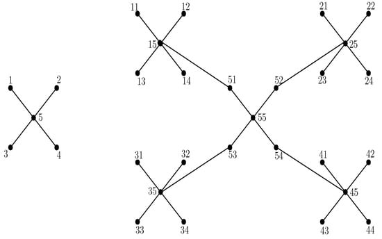 Figure 4 presents the extended Sierpiński graph . This graph is created by adding a new vertex to the generalized Sierpiński graph and connecting it to the extreme vertices.