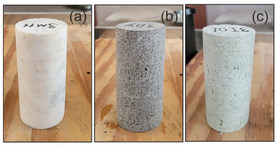 Three different rock types, diabase, marble, and ignimbrite, are used in this study. These rocks have no visible (macro) fractures/cracks and a relatively homogeneous internal structure. This property enables the minimization of the effect of pre-existing defects on mechanical behavior (Figure 1). For each rock type, 40 cylindrical (core) samples in ASTM [41] standards (2 ≤ L/D ≤ 2.5, L: length, and D: diameter) were subjected to uniaxial and triaxial compressive strength tests and tensile strength tests. From these experiments, four fundamental mechanical parameters of these rocks, such as uniaxial compressive strength (UCS), tensile strength (UTS), Young’s (Elasticity) Modulus (E), and Poisson’s ratio (ν), were determined, and Hoek–Brown failure envelopes [42] were plotted. These macro properties were then used in the calibration of numerical models whose details are given in the following section.