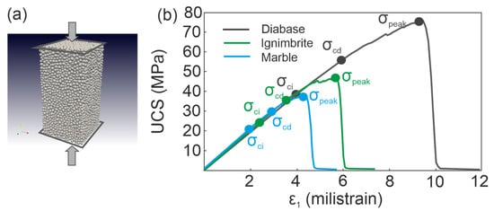 (a) Configuration of 3D DEM model under uniaxial compressive loading; (b) stress–strain responses and critical stress levels of the rock materials.