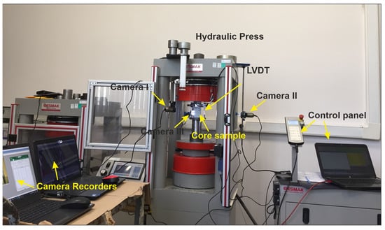 Experimental setup for the stress-controlled uniaxial compressive strength test.