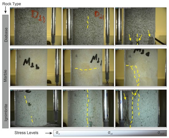 - During the recording of the loading process, the mesoscale cracking patterns could not be detected in marble and diabase by digital cameras, while ignimbrite presented visible crack development. Contrarily, at the microscale (under polarizing and scanning electron microscopes), intensive cracking is mostly detected in marble and diabase.