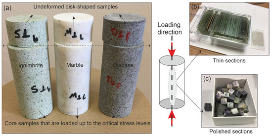 (a) Loaded core- and unloaded disk-shaped samples; (b,c) thin and polished sections prepared from these samples.