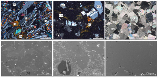 Images of all rock types under the polarizing microscope (top) and SEM (bottom): (a) diabase; (b) ignimbrite; (c) marble. (The thin sections were viewed at 4× in crossed polarized light (XPL). Mineral abbreviations based on the study by Whitney and Evans [48]: Afs—alkali feldspar, Bt—biotite, Cal—calcite, Chl—chlorite, Pl—plagioclase, Px—pyroxene).