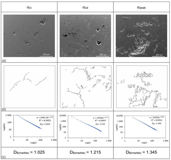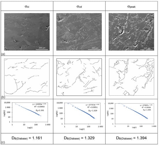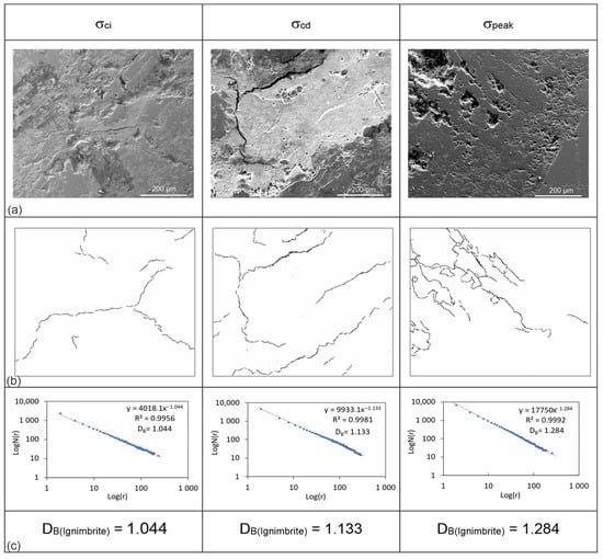 In the SEM analysis, 522 images were taken at different magnitudes of scales ranging between 40 μm and 500 μm. The images were selected in which cracks are obviously visible and that also demonstrate the overall crack pattern for the fractal analysis (Figure 7a, Figure 8a and Figure 9a). Therefore, the scale magnitude of the images was selected as 200 μm (equivalent to 400× magnification), which is the same for all of the images taken in high vacuum mode, 10,000 kV with an ET detector. These images that represent the cracking in samples for three different critical stress levels, σci, σcd, and σpeak, were scaled in pixels through the digital image processing technique by using ImageJ software. The stress-induced cracks in the images were first drawn as lines representing crack traces. To distinguish these crack traces from the rest of the image, they were converted to 8-bit images, and then black-and-white thresholds were applied to them. As a result, binary images with white backgrounds and black crack traces were derived, and the crack pattern for each image was digitized (Figure 7b, Figure 8b, and Figure 9b). The box-counting method in the FracLac plugin was applied to these binary images. The image type was selected as binary and the background was set as white. Six grid positions (scan types) in fixed grid scanning were used to find an optimal covering. The scale was arranged such that the smallest box size was 2 pixels and the largest box size was 30% of the binary image size. By running the software with this configuration of input parameters, log Nbox(r) vs. log r plots were drawn and the slopes (β) of the linear fits adjusted to the data on these plots were read. By substituting these slope values in Equation (7), the fractal dimension (DB) values of the crack patterns for three loading stages were determined (Figure 7c, Figure 8c, and Figure 9c).