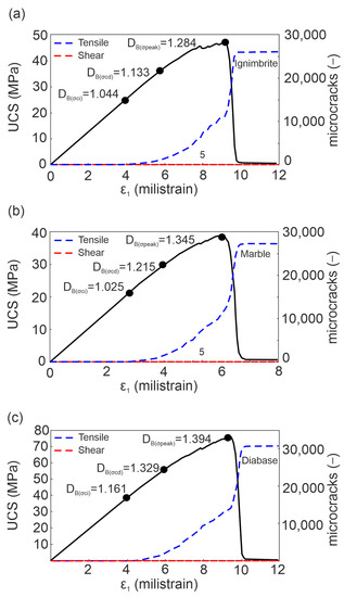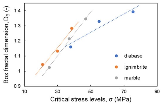 Overall, the DB values of cracking patterns at the critical stress levels demonstrate an explicit increment with increasing stress (Figure 11). Thus, the progressive crack accumulation was assessed using fractal theory to have an explicit quantitative data platform for the damage mechanics in rocks.