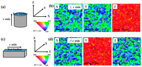 Schematic diagram of sample for EBSD and the EBSD results. (a,c) The test surfaces are perpendicular to (parallel to) the c-axis orientation direction. (b) EBSD orientation map of the surface perpendicular to the c-axis orientation direction, where sample Z direction is the c-axis orientation direction. (d) EBSD orientation map of the surface parallel to the c-axis orientation direction, where sample Y direction is the c-axis orientation direction.