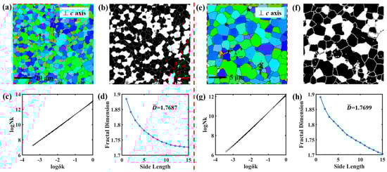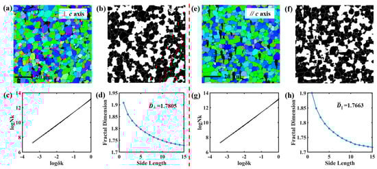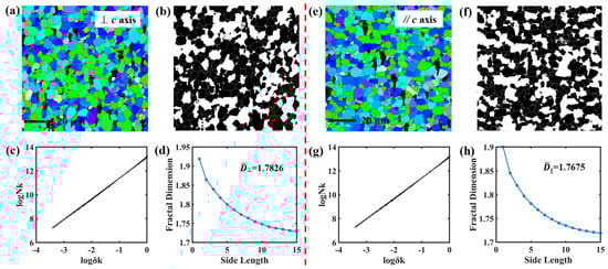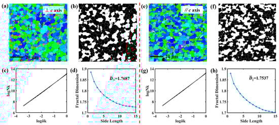 Figure 3a,e show the EBSD results of S1 with the test surface perpendicular to the c-axis direction and parallel to the c-axis direction, respectively. The EBSD orientation map demonstrates the texture orientation in addition to a clear grain profile of the micromorphology. As shown in the figure, the grains parallel to the c-axis direction show a rounded profile (Figure 3a), while the grains perpendicular to the c-axis direction show a flat profile (Figure 3e). Based on the self-similarity of fractal theory, the complex morphological information of two surfaces of S1 is analyzed. Figure 3b,f show the binary images of the morphology, i.e., the sample morphology is treated as black and white. It has been previously reported in the literature that different gray-level thresholds affect the resolution effect of the binary image []. Smaller or larger thresholds distort the binary image, resulting in a poorly resolved grain profile, which in turn affects the calculation of the fractal dimension. In this work, the gray-level threshold we used is 0.5 to ensure the accuracy of the calculation results. Figure 3c,g show the fitted results in the form of a logarithm of the side length of boxes and the number of boxes, and there are 15 fitted lines in each figure. The dependency of box side length and fractal dimension indicates that the FD gradually decreases and tends to stabilize as the box side length increases. The average value of the fractal dimension of the sample surface perpendicular to the c-axis direction is 1.7687 (), and the average value of the fractal dimension of the sample surface parallel to the c-axis direction is 1.7537 (). The values of the average fractal dimensions are similar in both directions, indicating that the magnets have high uniformity and consistency.