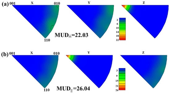 In order to have a further understanding of the degree of texture orientation through the experimental data, Figure 6 shows the inverse polar figures from the EBSD data. The MUD of the sample Z direction for the surface perpendicular to the c-axis direction of 22.03 and the MUD of the sample Y direction for the surface parallel to the c-axis direction of 26.04 are obtained for the S1 sample. Figure 7 shows that the S2 sample has the MUD perpendicular to the c-axis direction of 13.02 and parallel to the c-axis direction of 18.93. Figure 8 shows that the S3 sample has the MUD perpendicular to the c-axis direction of 15.63 and parallel to the c-axis direction of 20.54. The average MUD in two directions is defined as , which represents the degree of texture orientation obtained from experimental data. Figure 9 shows the different representations of the degrees of texture orientation for the three samples. It is obviously demonstrated in the figure that the degree of texture orientation obtained by combining the surface morphology with the fractal dimension is consistent with the MUD values measured by the EBSD experiment and the squareness factors obtained from demagnetization curves. This further indicates that the fractal dimension of the surface morphology can indeed be used to calculate the degree of texture orientation. The correlation between the remanence and the degree of texture orientation is obtained by the calculation of the fractal dimension. The novel insight will provide new ideas for the design of high-performance Nd-Fe-B permanent magnet materials with high remanence.