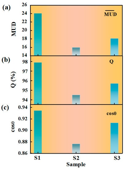 The multiple parameters (MUD, Q, and cosθ) indicating the degree of texture orientation for S1, S2, and S3 samples. (a) Multiples of uniform density (MUD); (b) Squareness factor (Q); (c) Calculated cosθ. The different colors represent different samples.