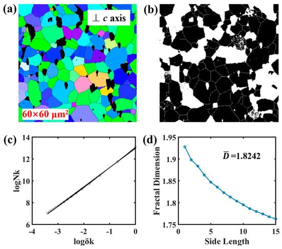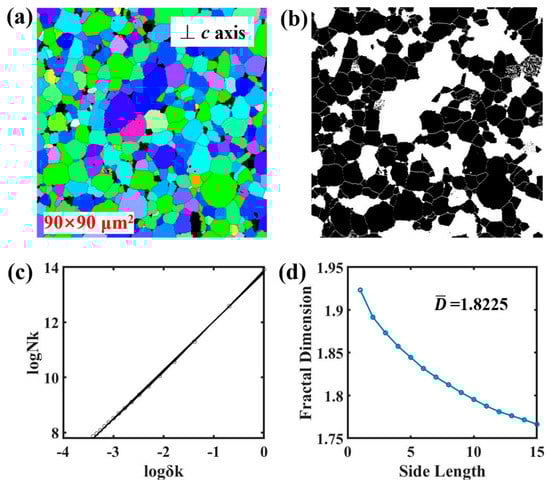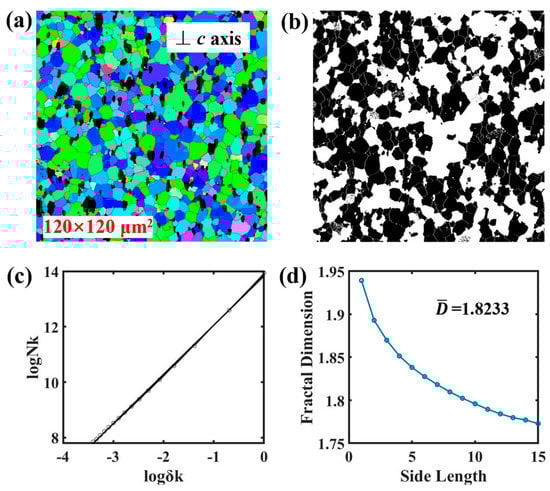 Results of EBSD micromorphology and calculation of fractal dimension for 120 × 120 μm2 scales of one other sample. (a) Micromorphology; (b) Binary image; (c) Fitted plot; (d) The dependence of the fractal dimensions on the side length of the box.