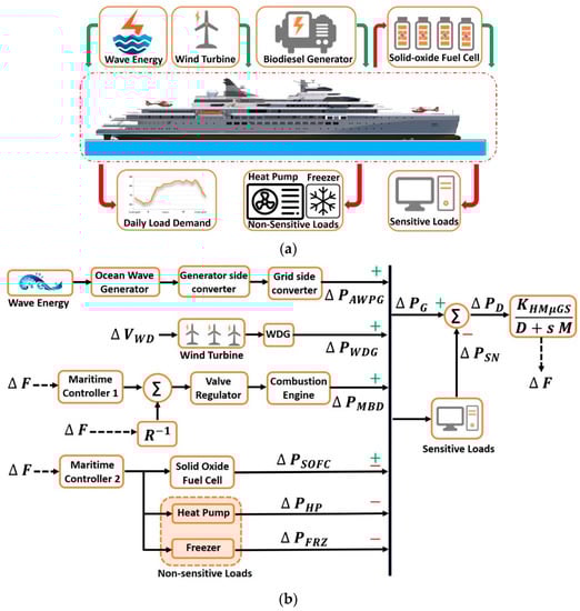 Recently, there has been growing interest in integrating energy storage systems (ESSs) and RESs into SPSs to reduce sailing costs, thus making such a system increasingly composed of a hybrid marine microgrid system (HMGS). In contrast, the frequency instability issue arises due to the intermittent nature of renewable energy sources (RESs) []. To solve this issue, numerous researchers have been working on using energy storage systems such as batteries, superconducting magnetic energy storage systems (SMES), and ultracapacitors as backup resources within hybrid power systems. Nevertheless, cost, conservation, and dumping concerns prevent battery energy storage from being widely used. On the contrary, the flow of costly helium liquid is a significant obstacle for SMES. For such cases, the dynamic tuning of controllable loads such as freezers (FRZ) and heat pumps (HP) may be necessary to reduce the volatility produced by RESs’ deployments. Therefore, the marine bio-diesel generator (MBG) and the non-toxic and eco-friendly solid oxide fuel cell (SOFC) can be considered as supplementary sets in these HMGSs in the standalone operation mode. Furthermore, to counteract the sporadic and erratic nature of RESs, much emphasis is placed in the literature on the appropriate size of various RESs/ESSs within HMGS [,]. However, less emphasis has been placed on developing control techniques for frequency regulation and power management in these HMGS [,,,].