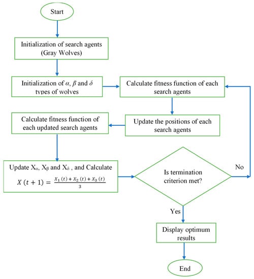 So, in GWO, the optimum search depends on the positions of α, β, and δ. They diverge while searching for prey and converge while attacking it. Mathematically, when 1 or −1, the search agent diverges to prey. Another variable in GWO that aids the exploration mechanism is named ; according to Equation (31), the value of varies between [0, 2], which affects defining the distance of the prey, as in Equation (29). As a result, GWO exhibits more random behavior, enhancing exploration and avoiding local optima. The overall flowchart of the GWO algorithm is presented in Figure 4; more details on GWO are given in [].