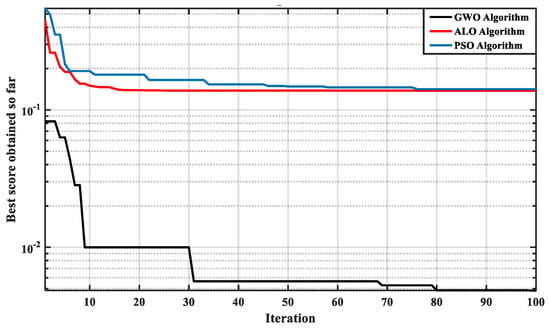 The effectiveness of the GWO algorithm used to fine-tune the suggested PIλDND2N2 controllers’ parameters in the considered HMGS is confirmed by evaluating its effectiveness against the other optimization algorithms used in the literature (e.g., ALO and PSO algorithms). This scenario is addressed in the following three different operation cases: