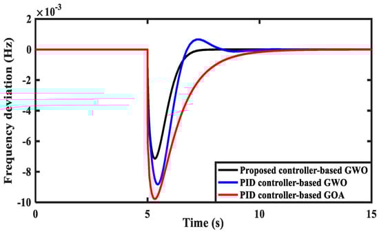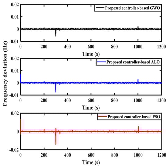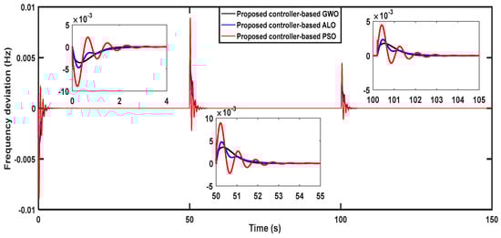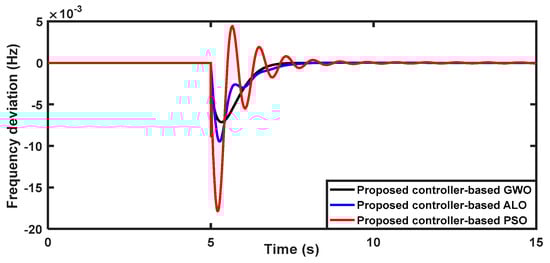In this case, the proposed PIλDND2N2 controllers in the considered HMGS are fine-tuned using the proposed GWO algorithm, in addition to the other two optimization algorithms (i.e., ALO and PSO algorithms), considering a 20% sudden load change in the sensitive load demand at t = 5 s. Additionally, this case considers the studied system without RESs (i.e., AWPG and WDG). The optimization algorithms used are set with 100 iterations and 30 search agents. The optimal parameters of the proposed PIλDND2N2 controllers, which are designed using various optimization algorithms (i.e., GWO, ALO, and PSO), are given in Table 2. Figure 5 shows the convergence curve of the optimization algorithms that are used. The proposed GWO algorithm outperforms the other algorithms in terms of convergence characteristics and objective function. Figure 6 shows the frequency deviation of the considered HMGS with the proposed PIλDND2N2 controllers, which were designed using various optimization algorithms under the operating conditions of this case. The results show that the suggested controller based on the GWO algorithm gives superior performance, with less overshoot, less undershoot, and a faster settling time than other optimization algorithms (i.e., ALO and PSO).