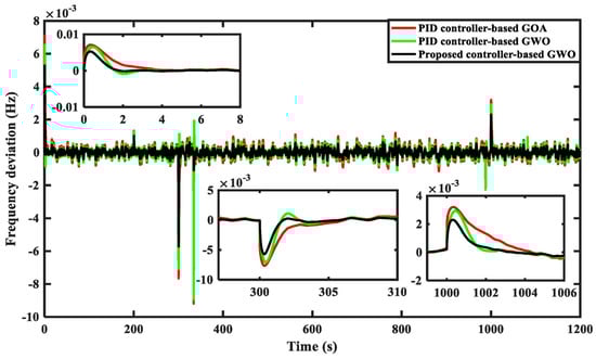 Under this case study, a random generation of WDG and AWPG, as shown in Figure 8, and a random load change in the sensitive load demand, as shown in Figure 9, are considered to examine the studied HMGS with the proposed PIλDND2N2 controllers, which are designed using various optimization algorithms. The profile of the load change in the sensitive load demand shown in Figure 9 was obtained using the random load model shown in Figure 10, which was extracted from []. The optimal gains of the suggested controllers designed using the various optimization algorithms used in this case are given in Table 2. Figure 11 shows the frequency deviation of the analyzed system with the suggested PIλDND2N2 controllers based on various optimization algorithms. The simulation results show that the suggested PIλDND2N2 controllers based on the GWO algorithm could dampen the high-frequency deviations resulting from high load/RESs fluctuations compared to other optimization algorithms. Therefore, the proposed PIλDND2N2 controllers based on the GWO algorithm give superior performance in improving the frequency stability of the considered HMGS than using the other optimization algorithms used in the literature. The system performance specifications in terms of maximum undershoot (MUS), maximum overshoot (MOS), and maximum settling time (Ts) for the investigated system are given in Table 3. From these numerical results, it is evident that the suggested PIλDND2N2 controllers based on the GWO algorithm surpass the other employed algorithms, leading to superior results. Therefore, it is most suitable for the frequency regulation of the considered HMGS.
