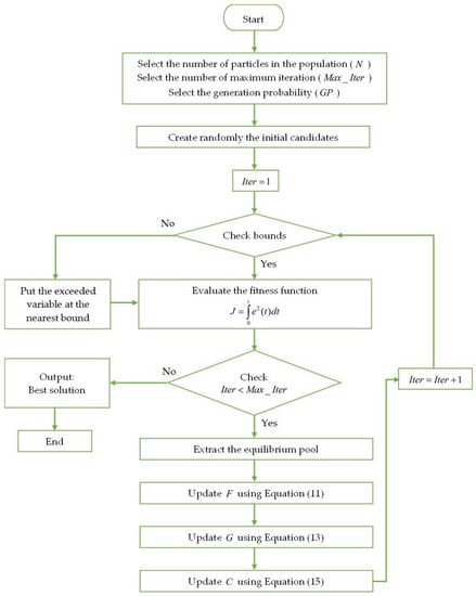 The is the generation rate control parameter that contains the potential of the generation expression assistance for the update procedure. and are random numbers in . is a specified value, which is called the generation probability. The updating of the individual solution of the EO is given in Equation (15). The flowchart of the EO is presented in Figure 1.