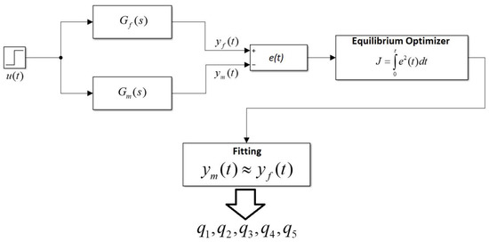 Equation (19) can be written in generalized form as Equation (20), and it is proposed as a model transfer function for the curve-fitting computation. Thus, the error function is written as e(t) = [yf(t) − ym(t)], and it is used as a fitness function in the EO optimizer.